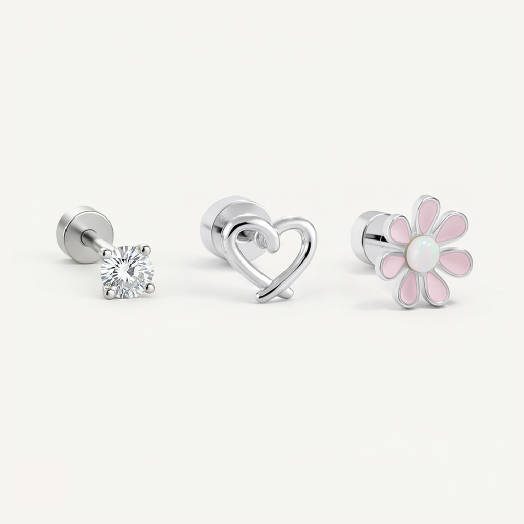 This adorable set includes Cubic Zirconia, Floral, and Open Heart Flat Back studs – designed to be worn together or separately for a touch of everyday magic.