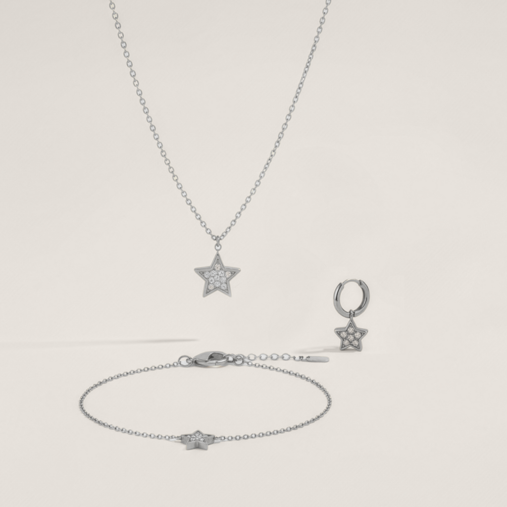 This curated set includes the Sparkle Star Charm Hoop Earrings, Bracelet, and Necklace - designed to shine beautifully together or worn separately.