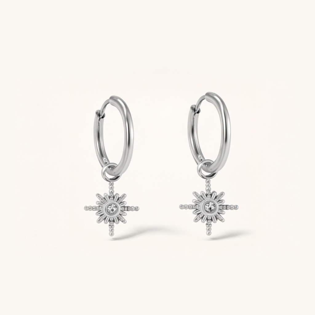 Find your direction with the Star Compass Charm Hoop Earrings. Silver or gold hoops featuring a compass charm - a subtle symbol of guidance and adventure.