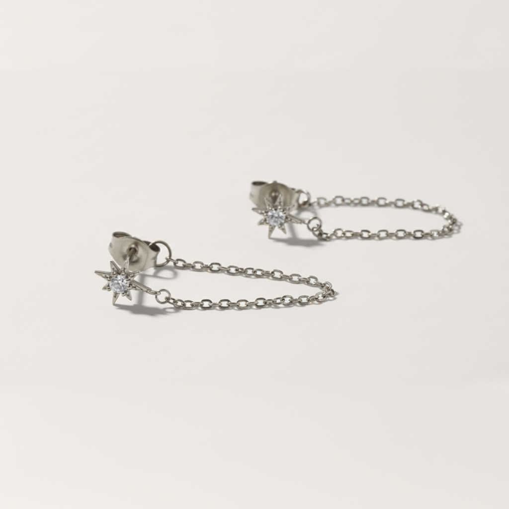 Add instant sparkle with the Starburst Chain Stud Earrings. This dainty star and chain design makes a statement alone or layered with your favourites.